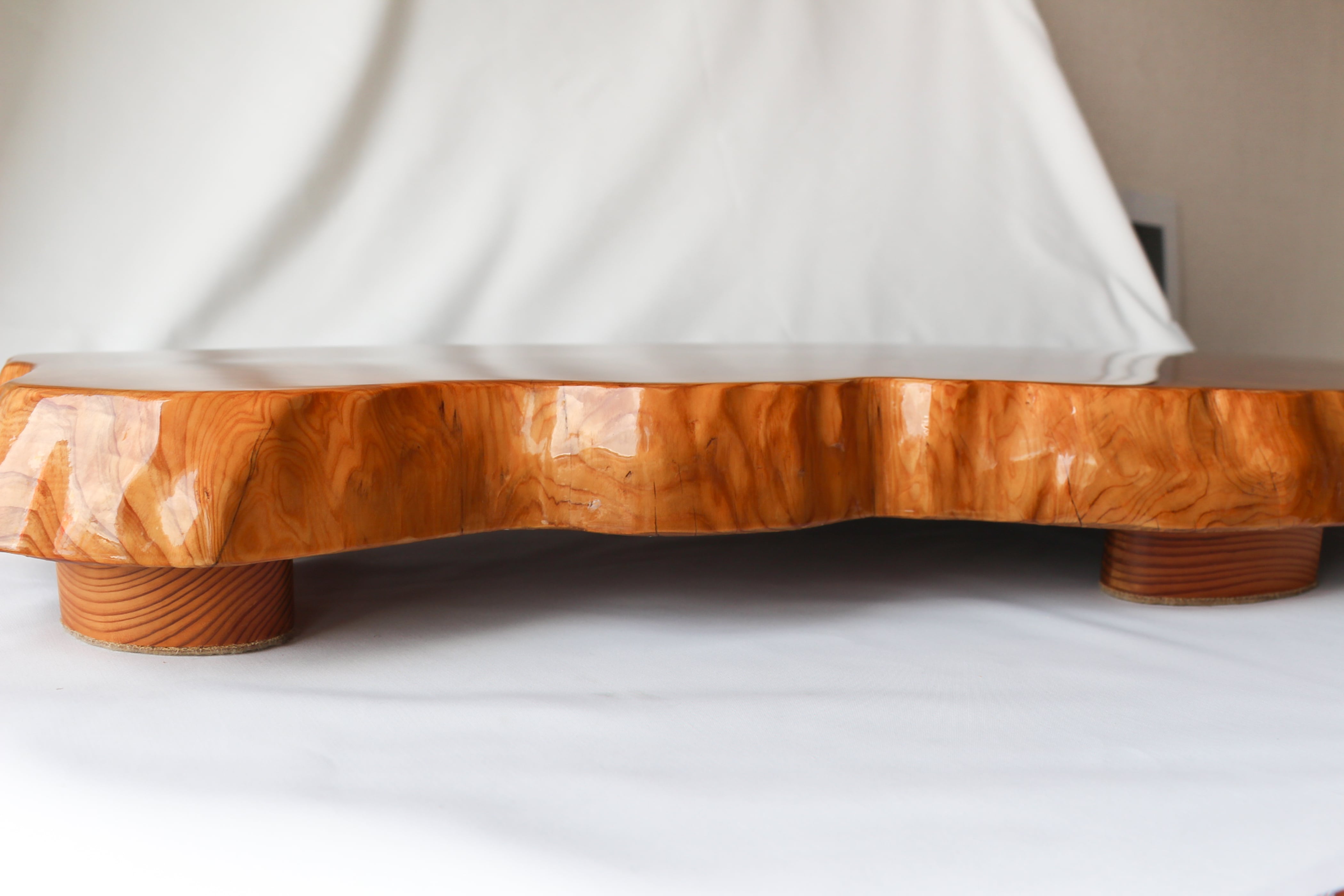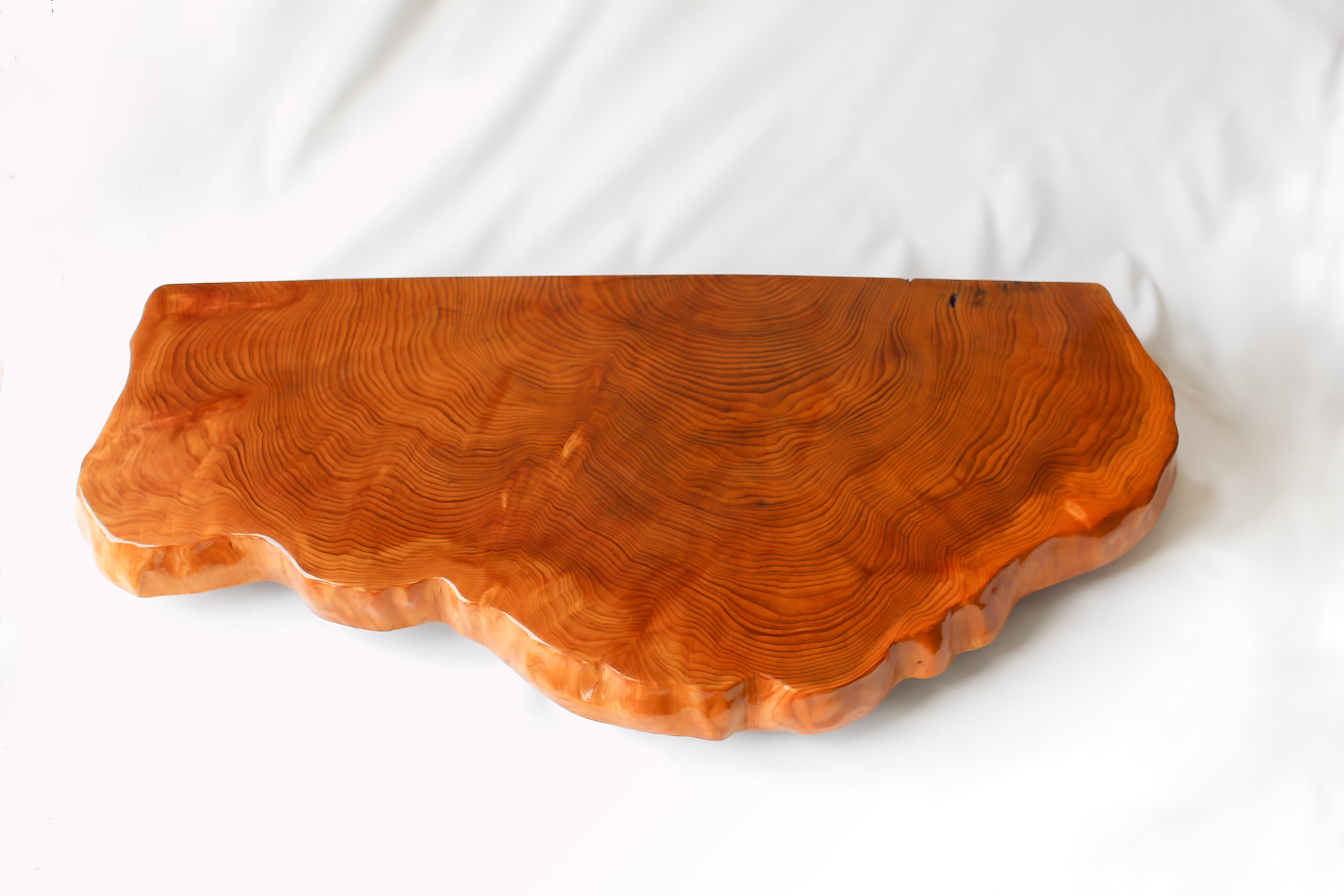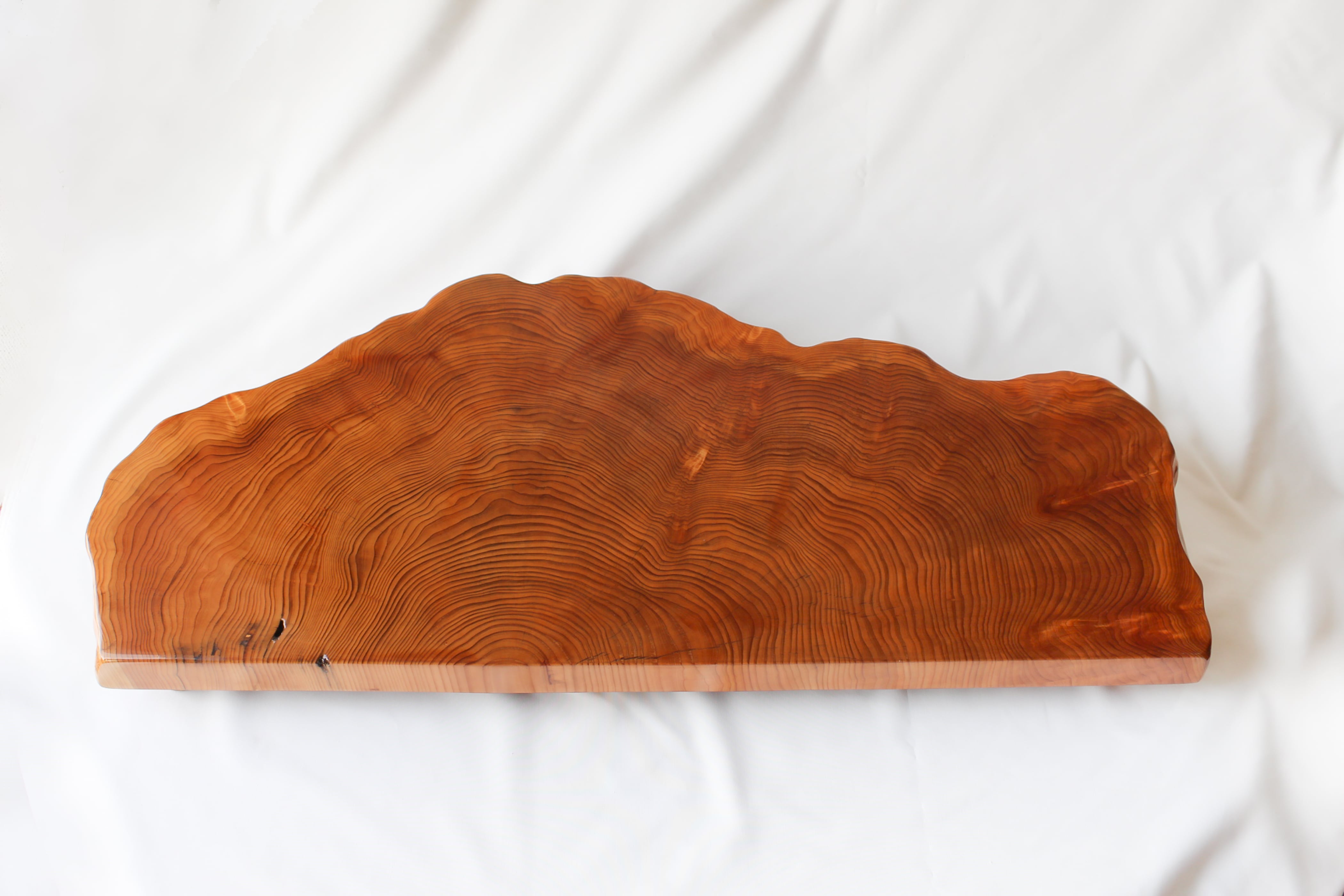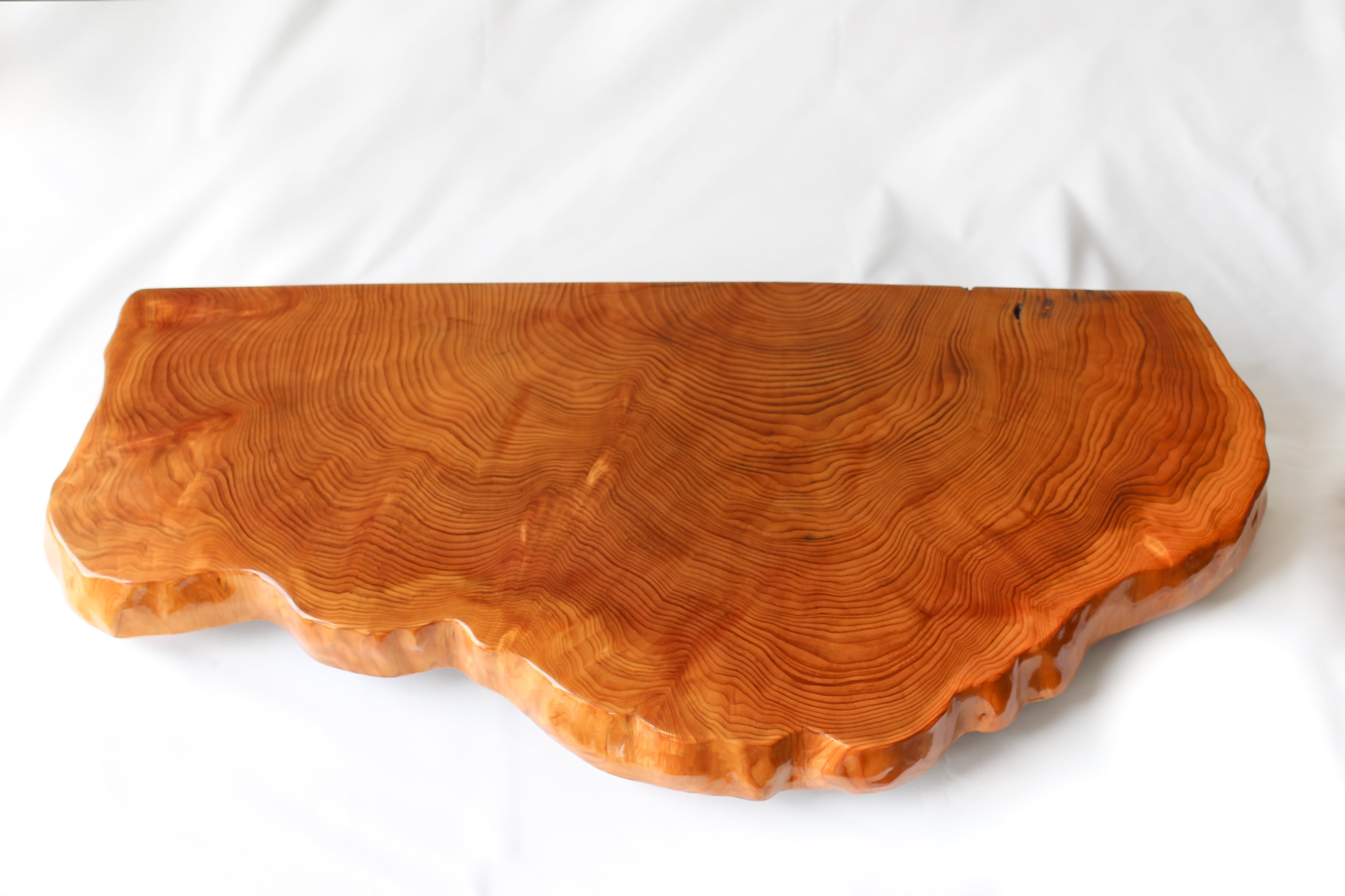 サイズ・横幅(W)89cm×奥行き(L)39cm×高さ(H)9.5cm 杉の古木です。 千葉の南部杉というブランド杉です。 杉は成長にとても時間がかかる木です。 その分目の詰まった丈夫で美しい木になります。 これは大木の輪切りのほんの一部分ですが、これだけの大きさに成長するのに一体どれだけの時間が必要だったか、数百年は余裕と想像されます。 大きめの花台に仕上げましたが、杉なのでとても軽いです。 複雑で美しい木を広い面でたっぷり楽しんでいただけます。