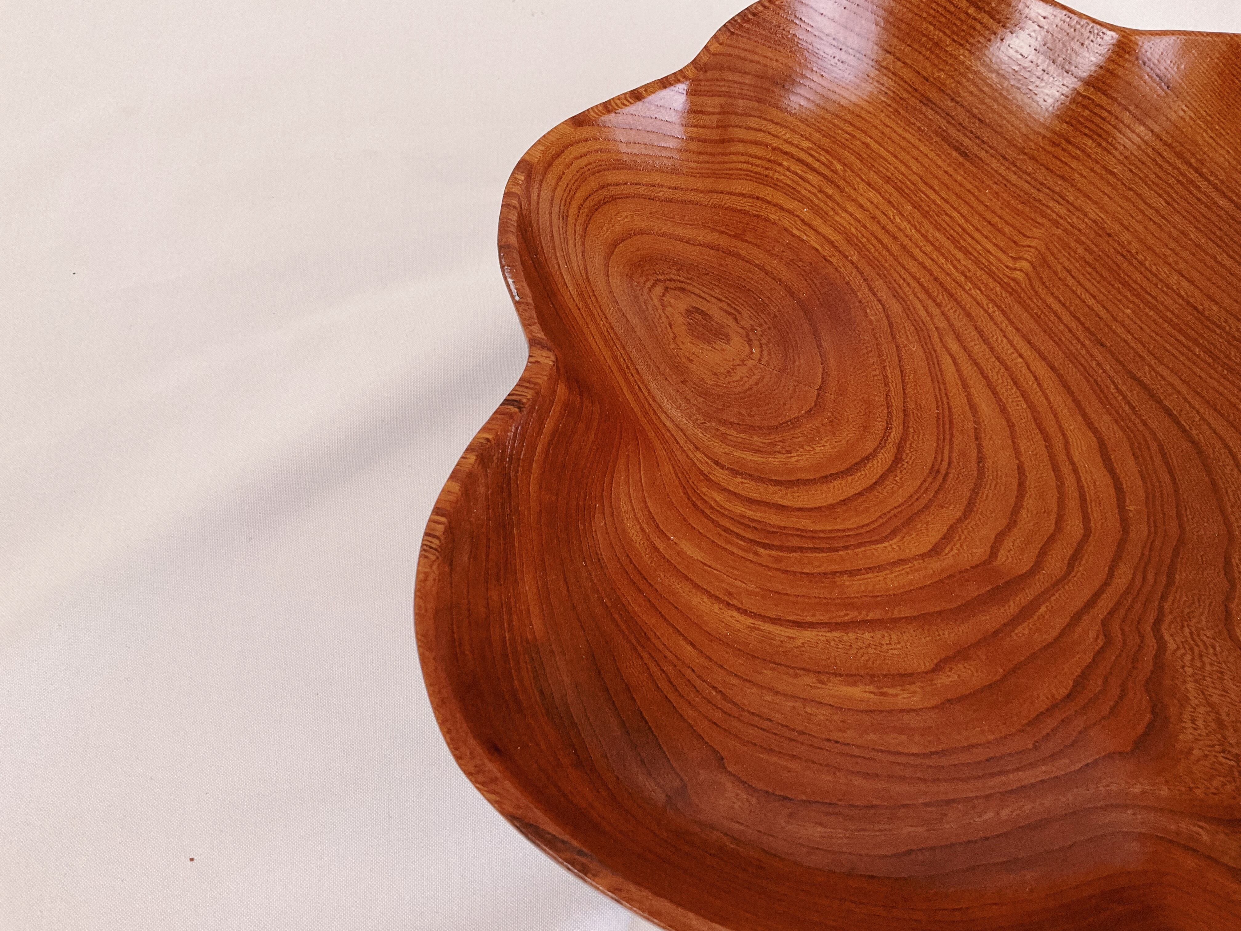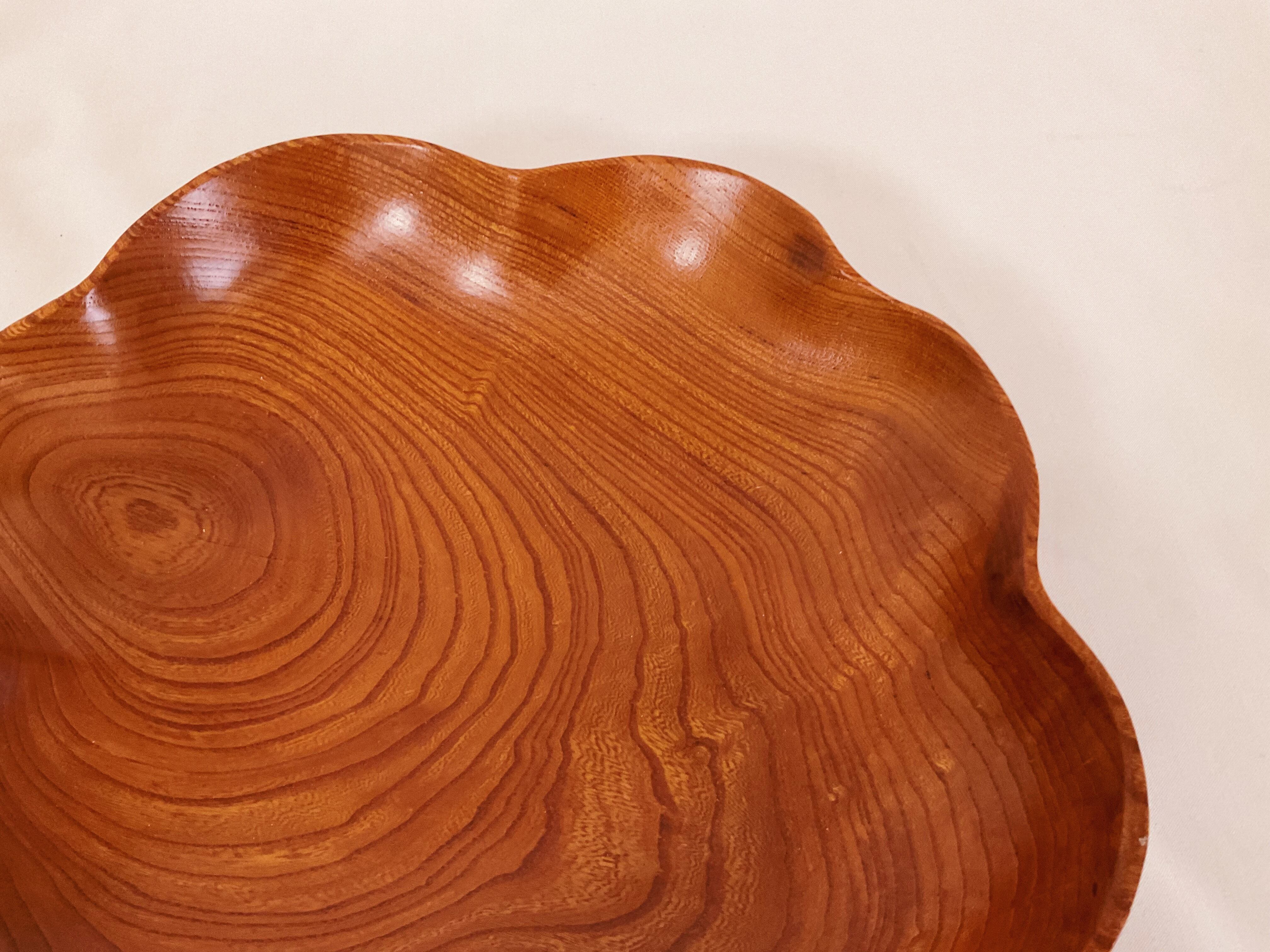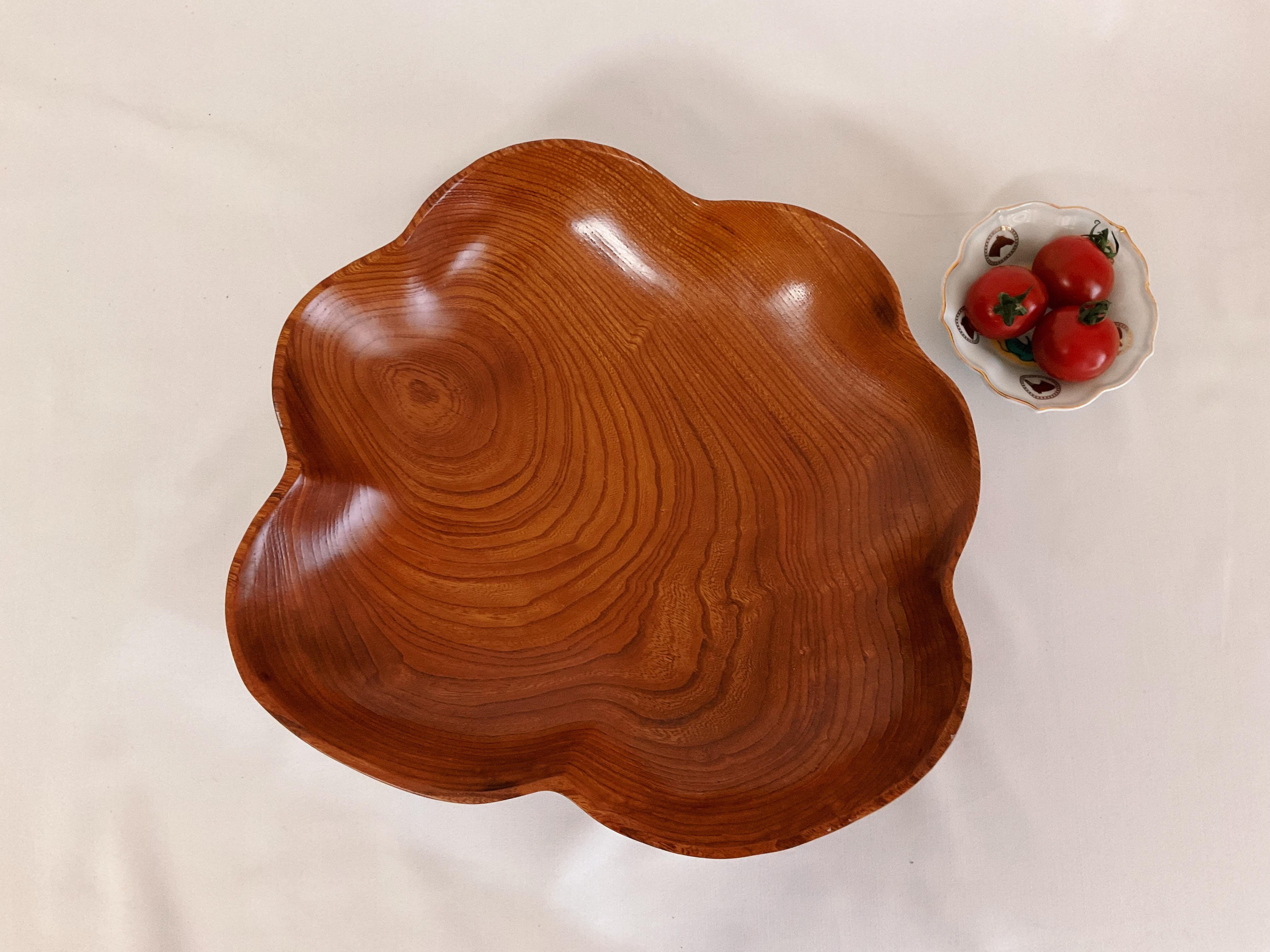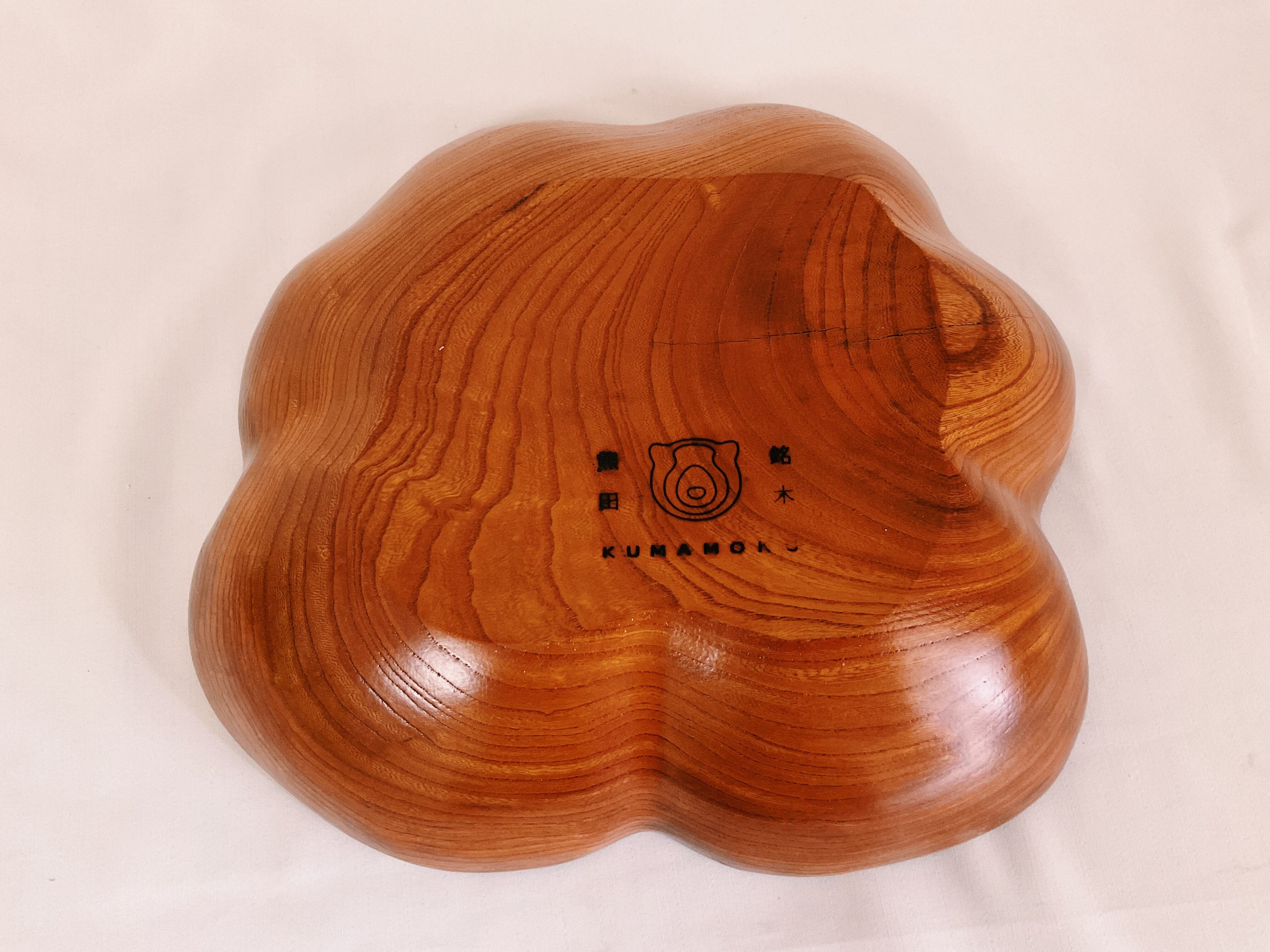 「紫の雲」は底面をやや厚めに作っており、花のように開く形ながらけやきの心地よい安定感をお手に取って頂けたときにきっと感じていただける品です。