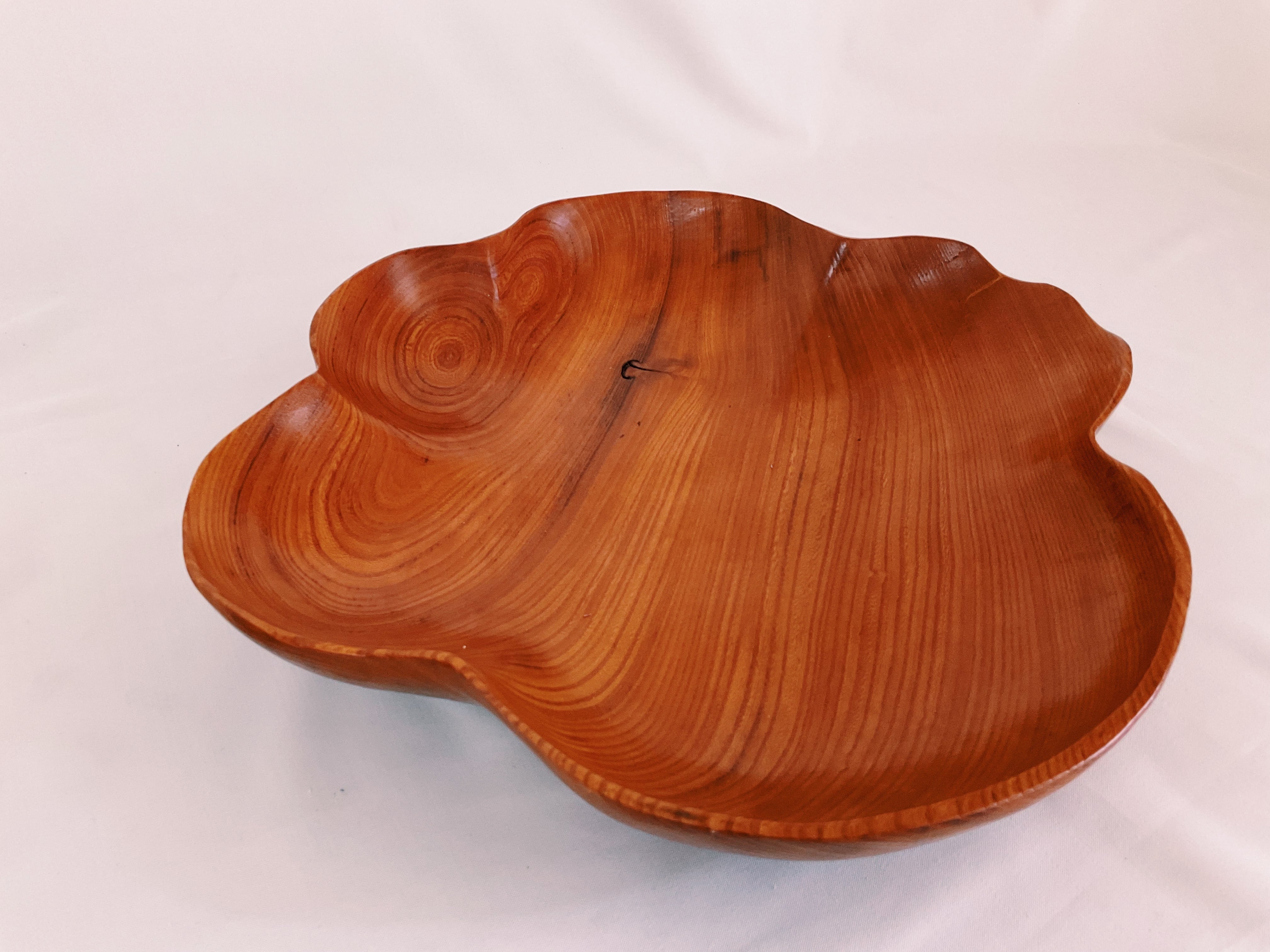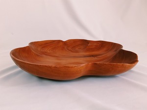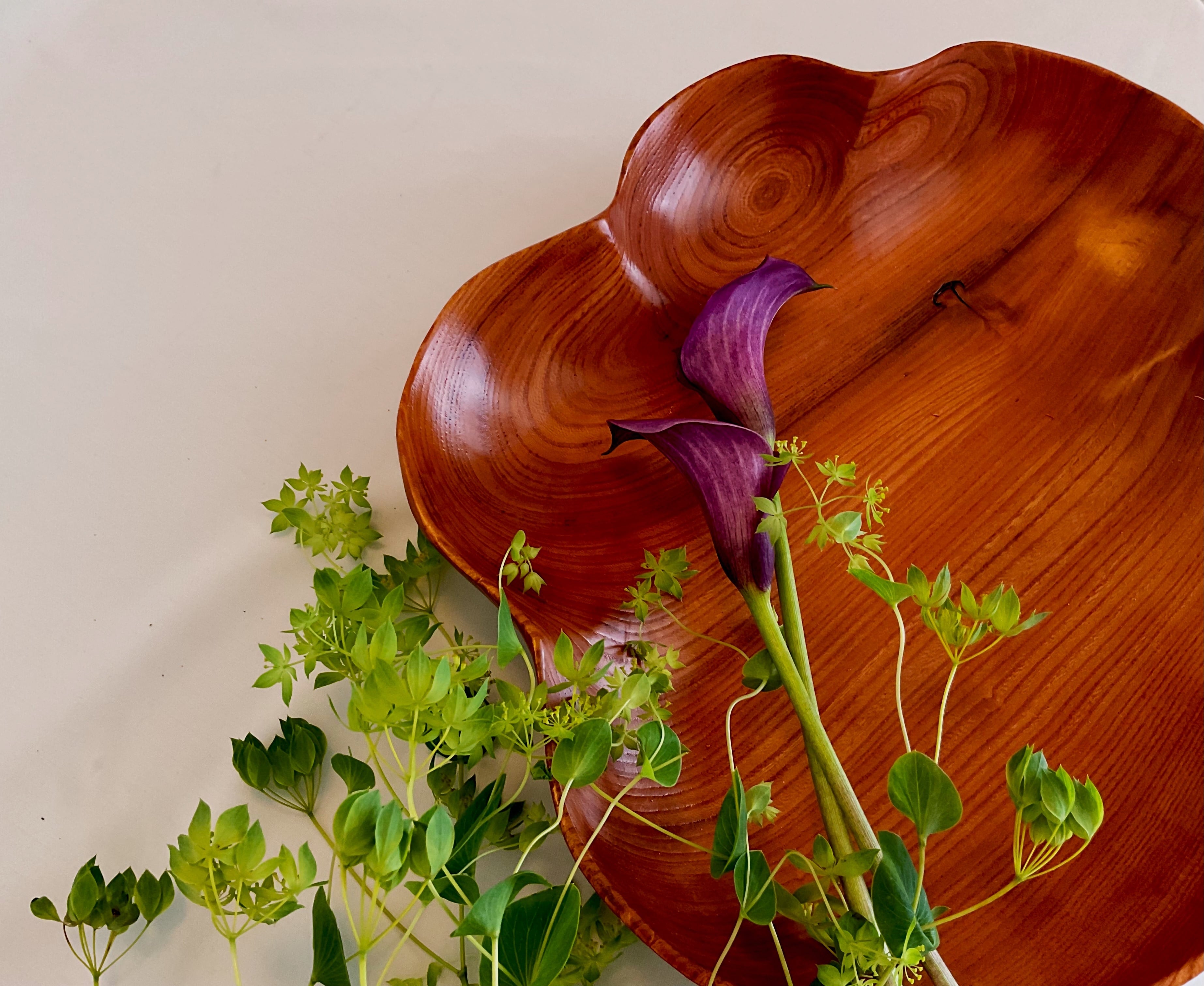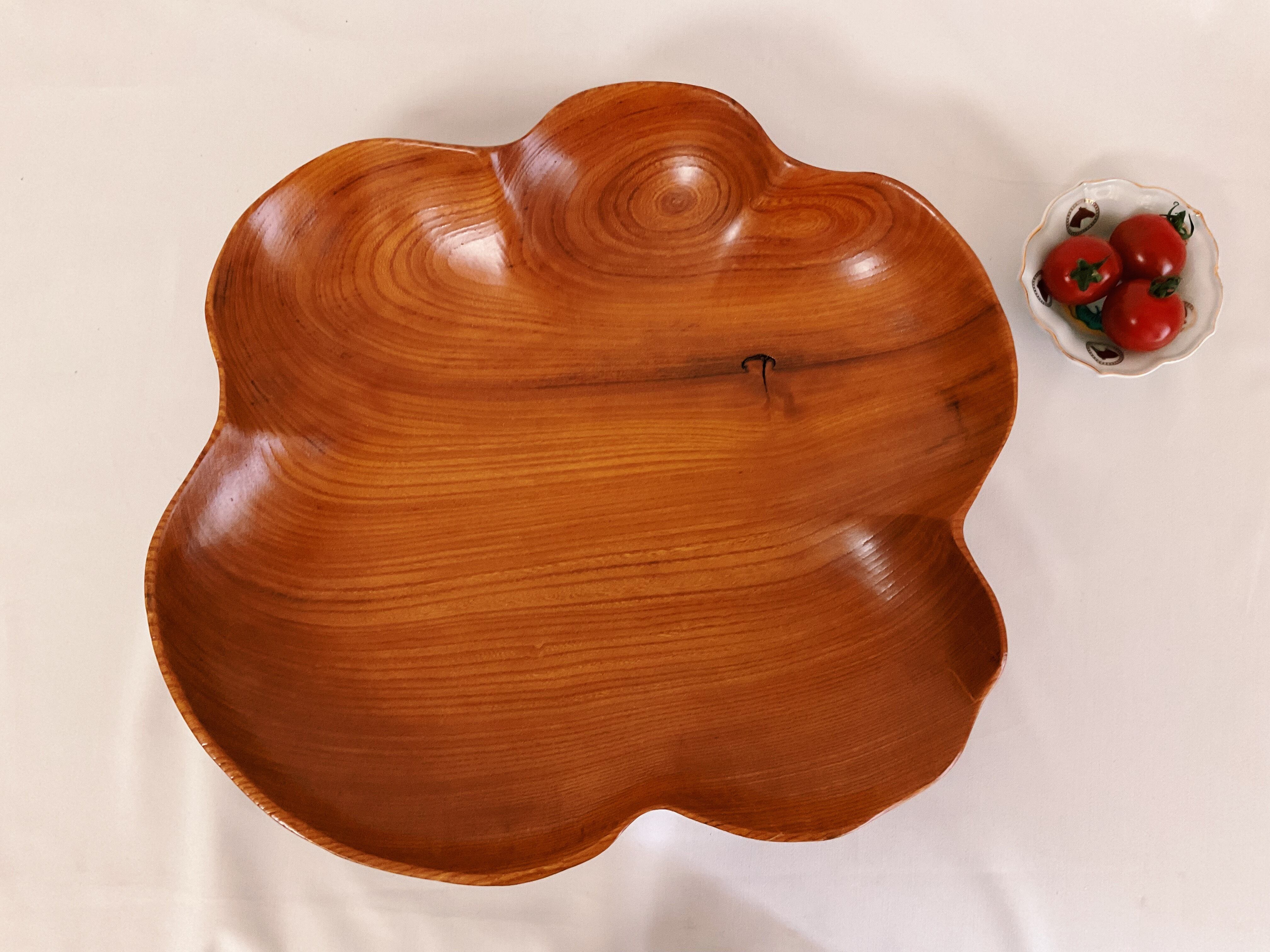 「花の雲」はきれいな丸い杢が浮かぶさまをひろびろと感じていただけるよう制作しました。果物やパンなどを豊かに載せても、また少しだけ載せてみた時でも絵になる、ふところの広い器です。